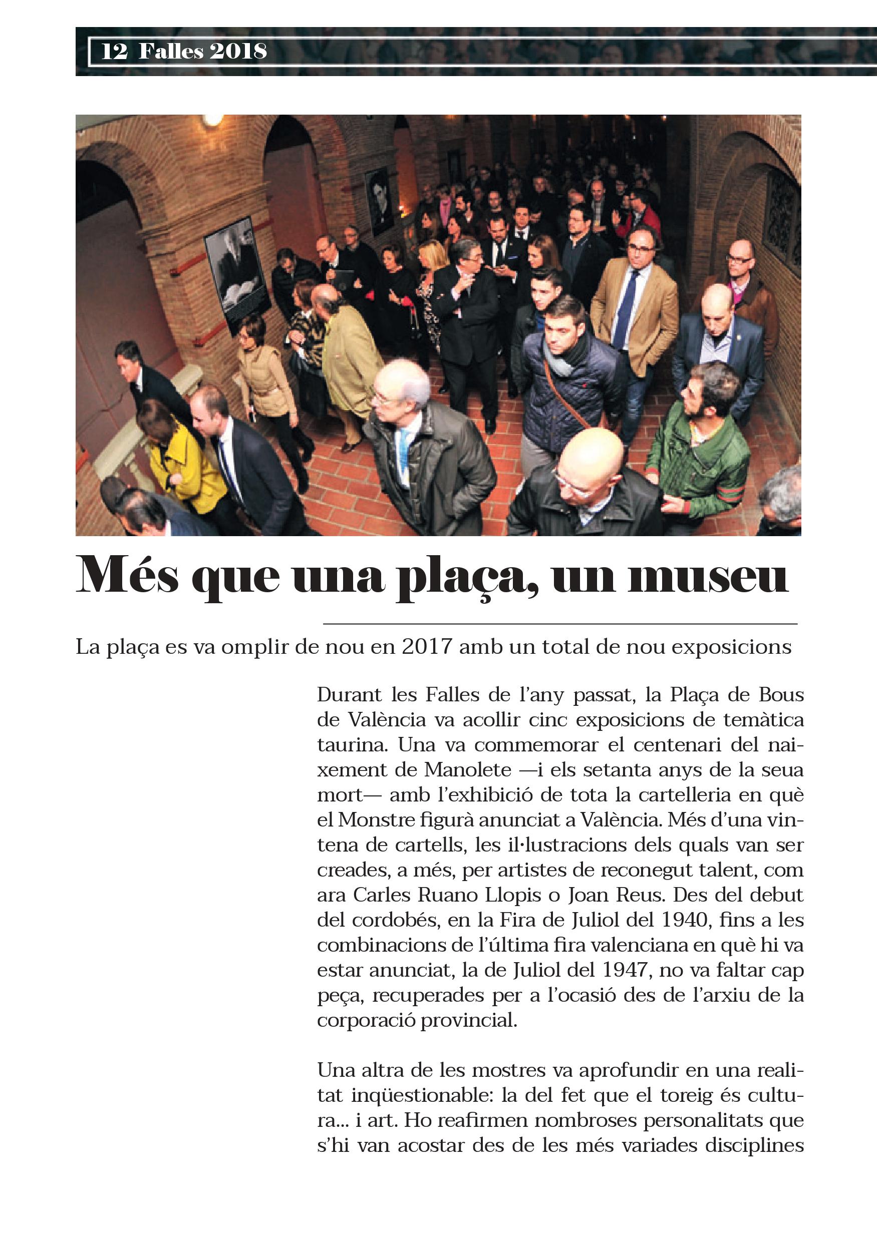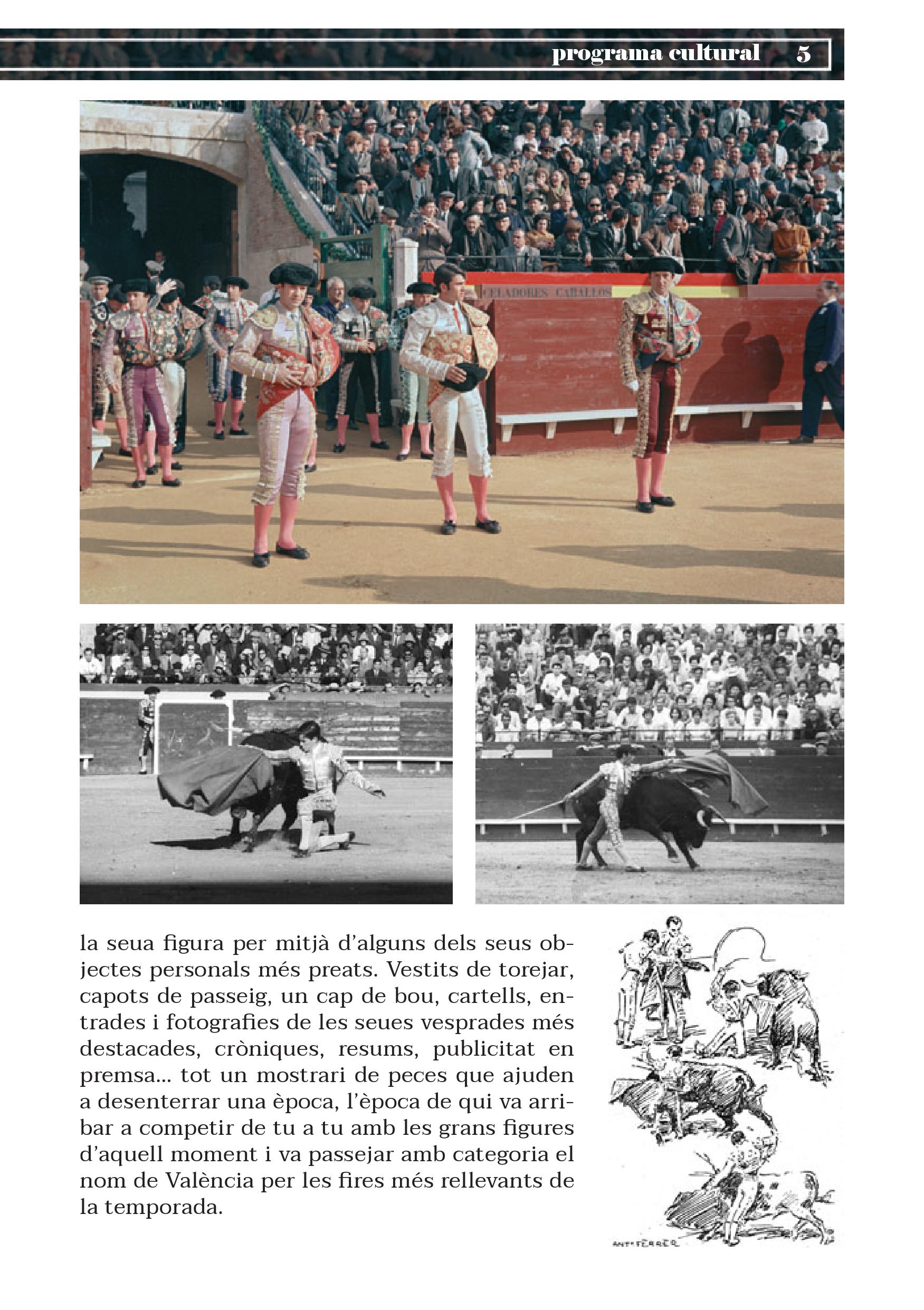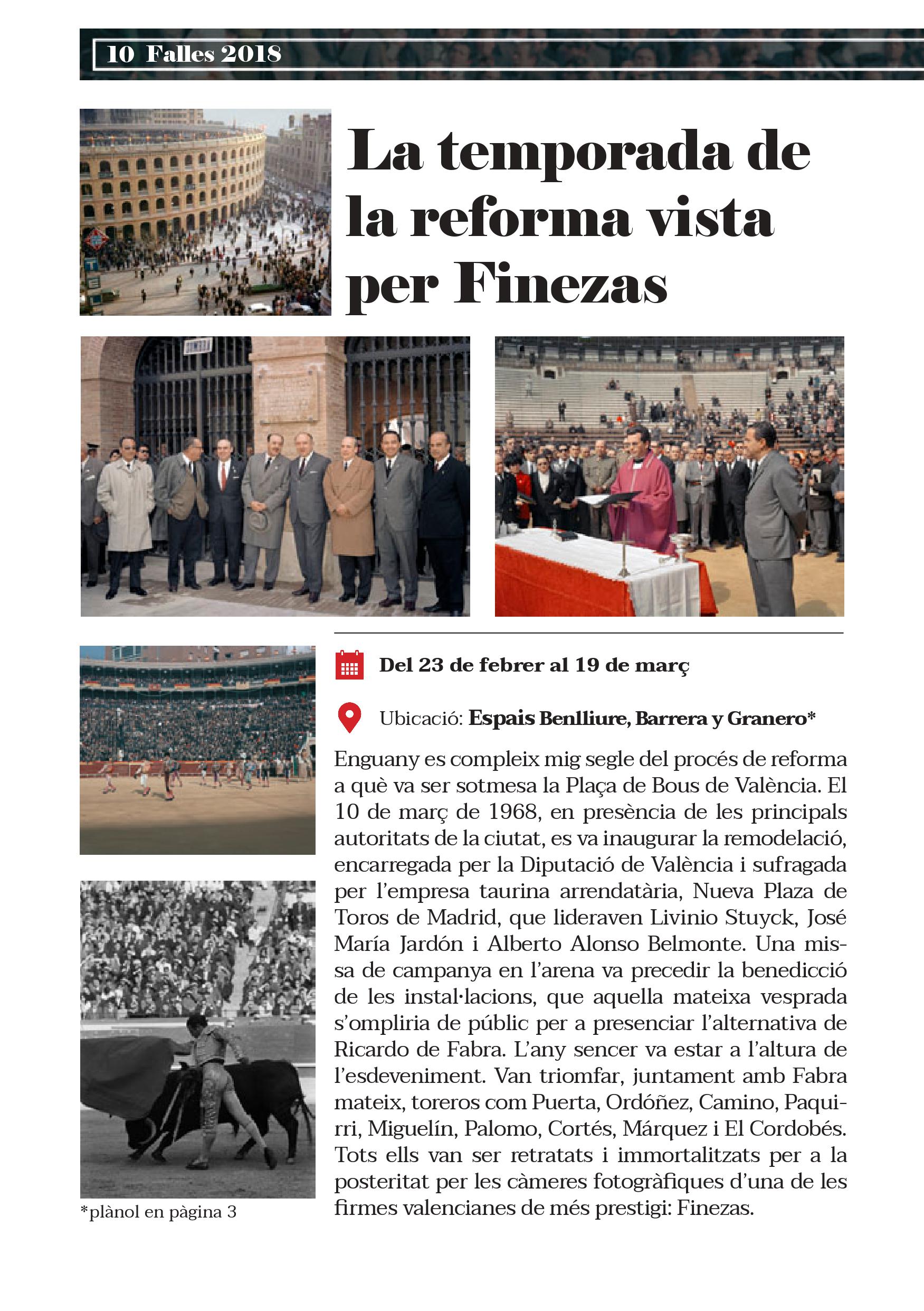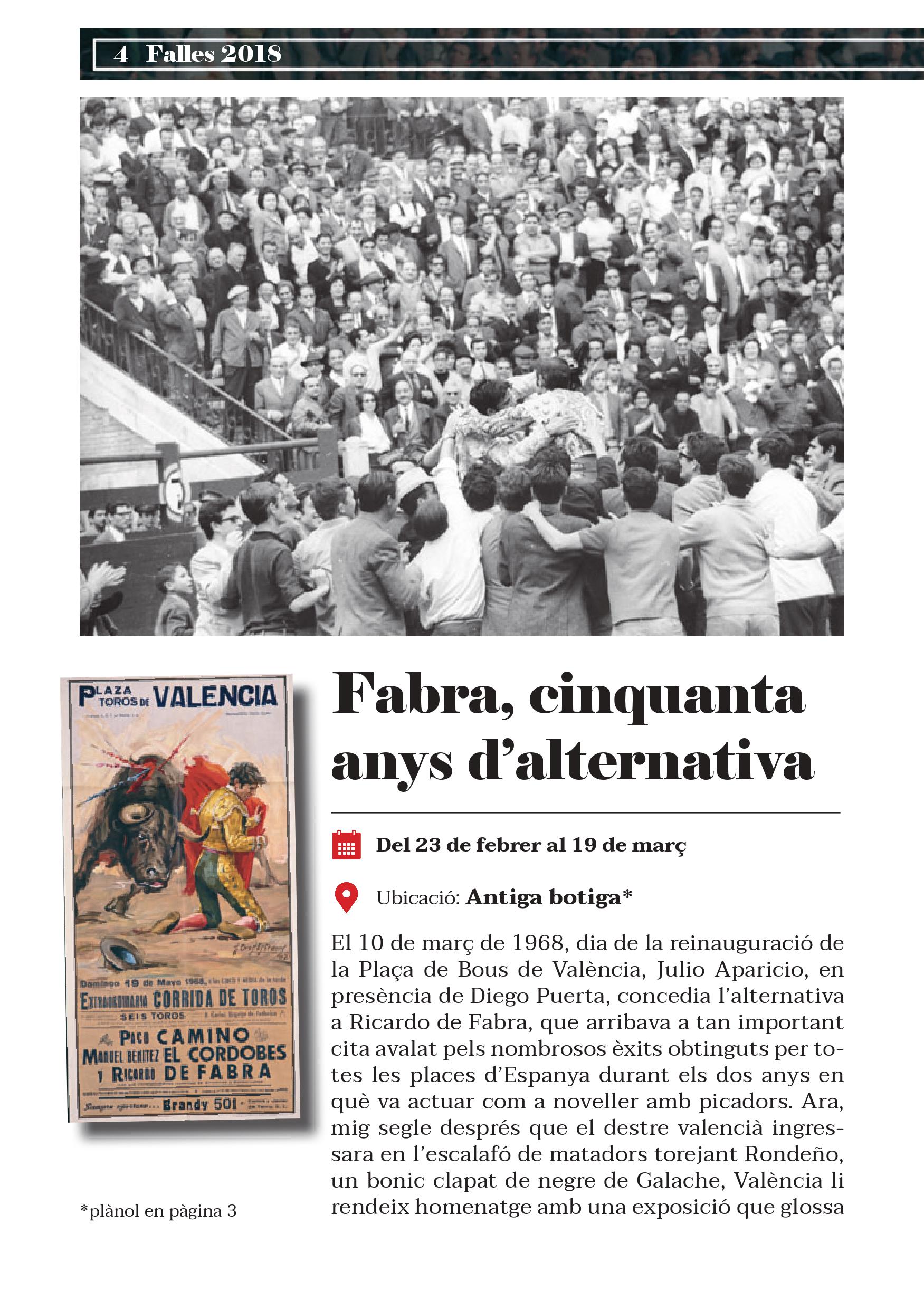 Aquestes Falles es commemoren cinquanta anys de la reinauguració de la Plaça de Bous de València. Precisament el mateix dia de la posada de llarg de la remodelació va prendre l’alternativa Ricardo de Fabra, torero valencià nascut a Alcàsser i criat a Torrent, a qui es dedica la primera de les set exposicions que es podran contemplar durant el cicle faller.