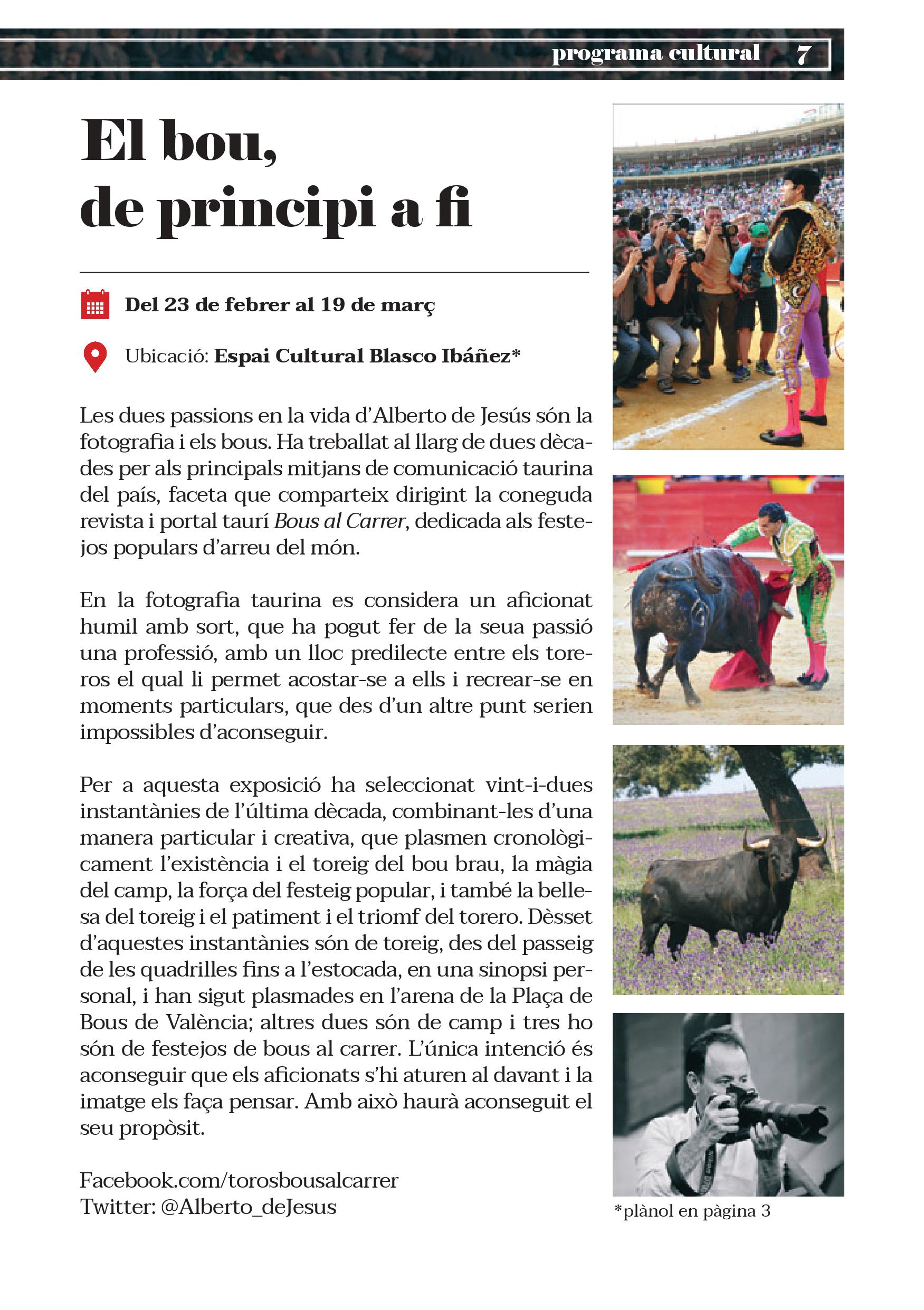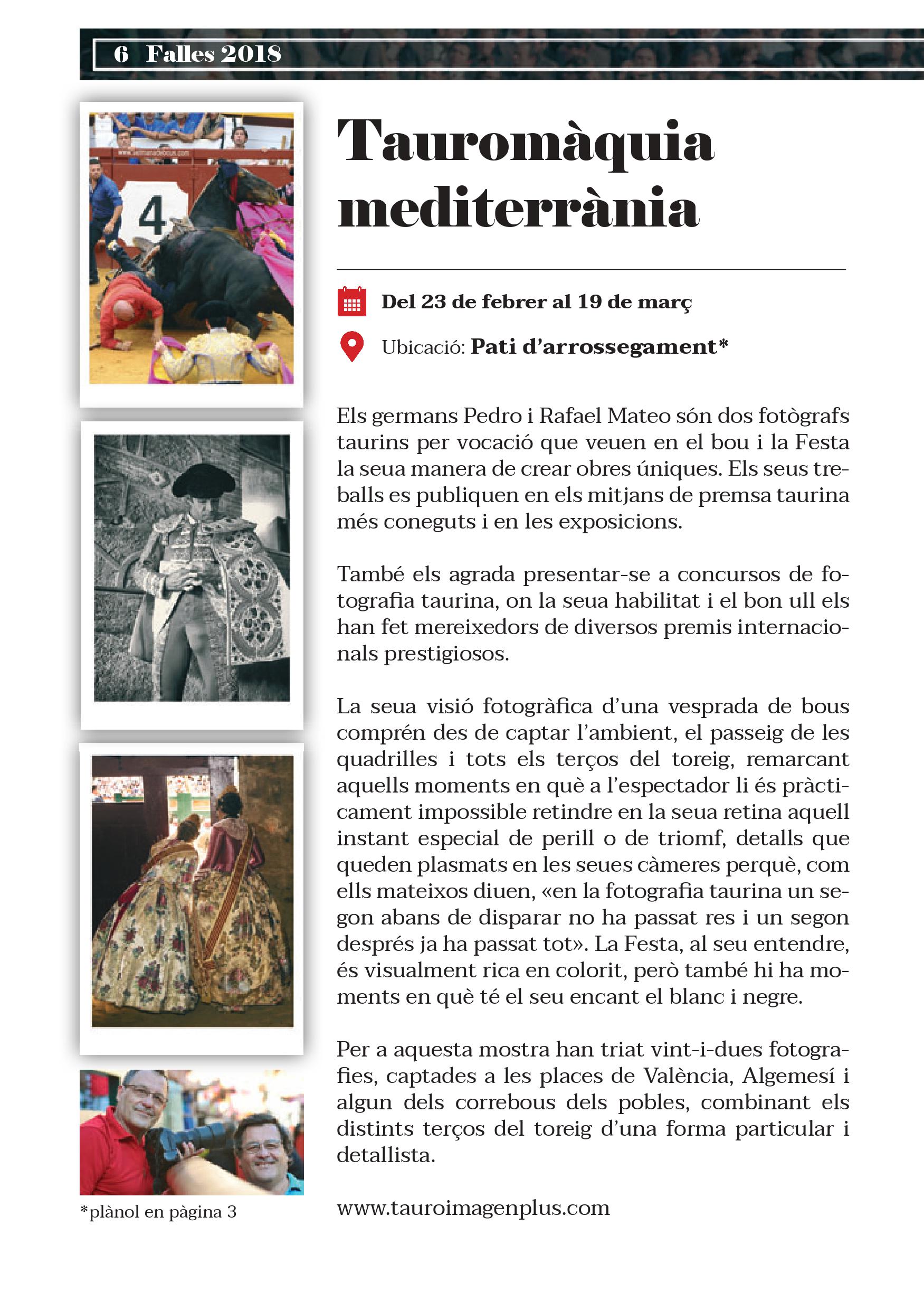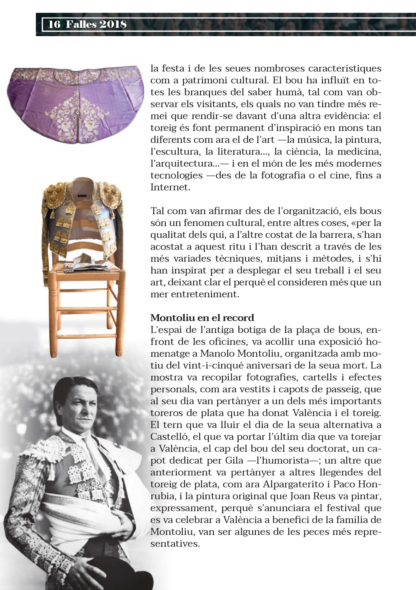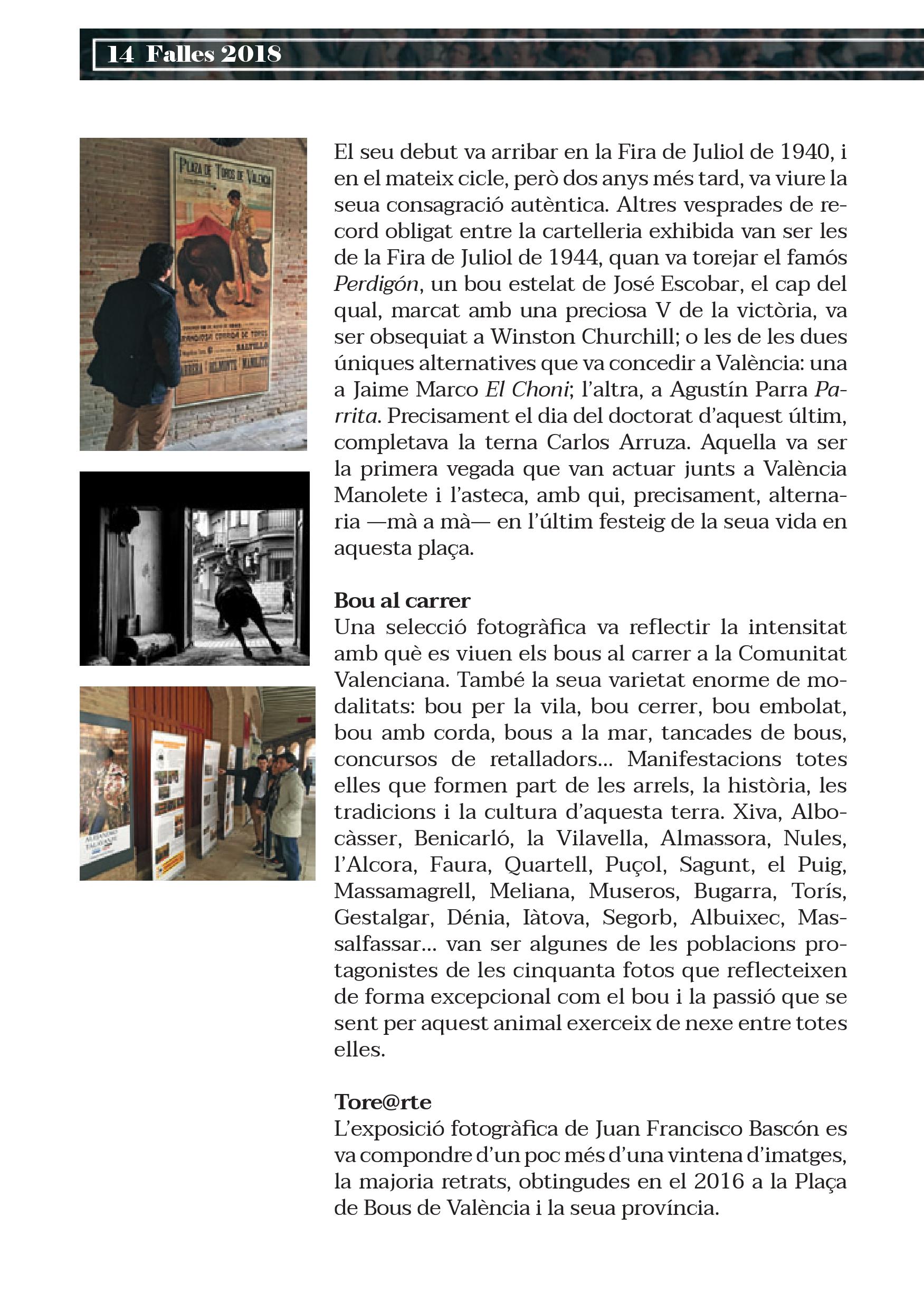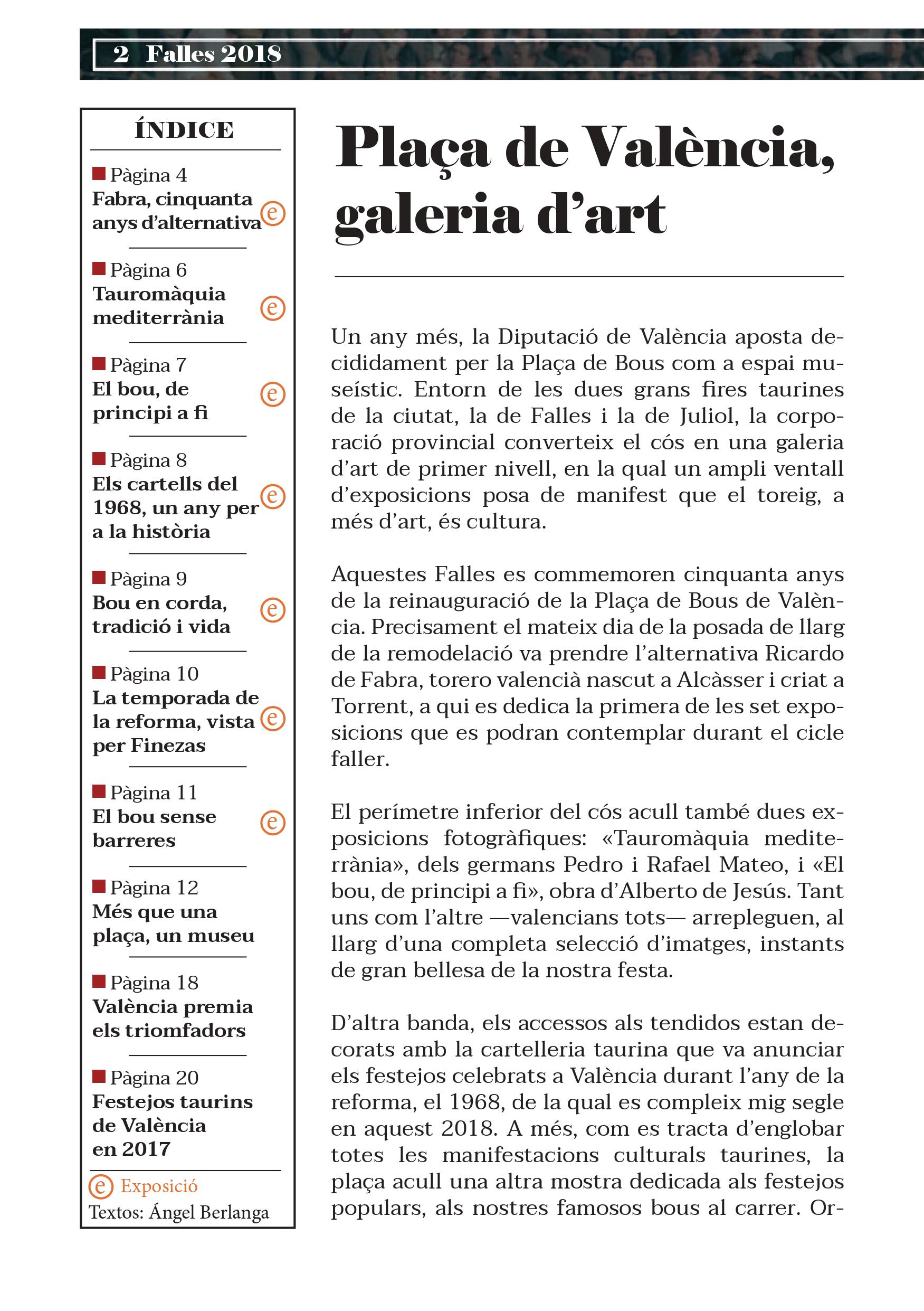 Aquestes Falles es commemoren cinquanta anys de la reinauguració de la Plaça de Bous de València. Precisament el mateix dia de la posada de llarg de la remodelació va prendre l’alternativa Ricardo de Fabra, torero valencià nascut a Alcàsser i criat a Torrent, a qui es dedica la primera de les set exposicions que es podran contemplar durant el cicle faller.