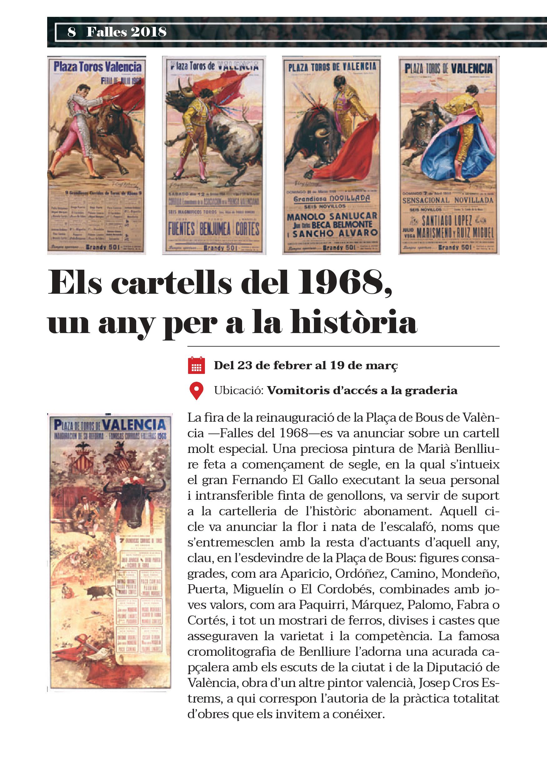 En este 2018, la plaça de València complix 50 anys des de la seua reinauguració en 1968. Per això, s'ha volgut recordar esta efemèride amb el mateix cartell amb què es van anunciar aquelles Falles del 68, obra de Mariano Benlliure, un dels artistes més rellevants i el mestre de l'escultura taurina.