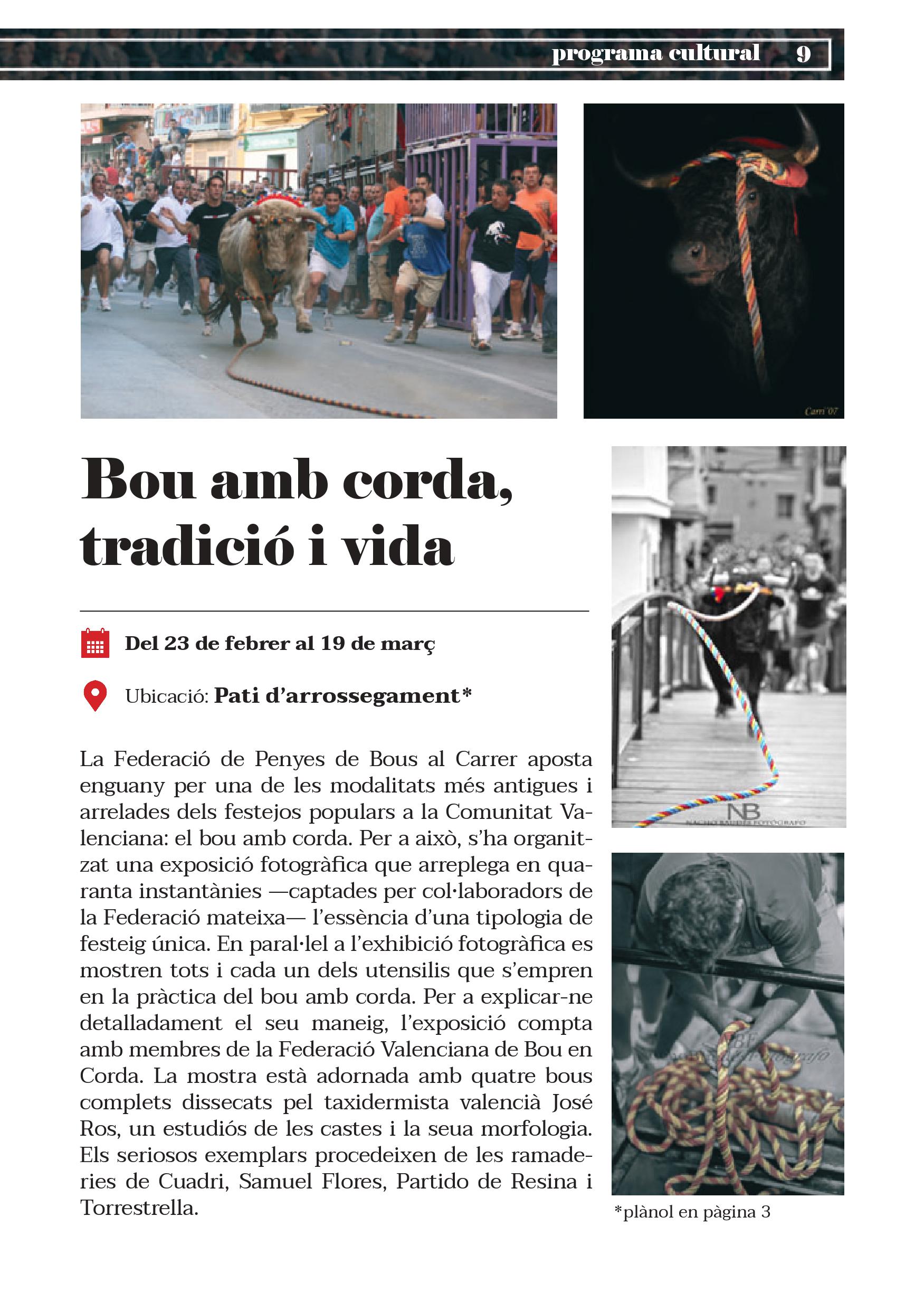 A més, com es tracta d’englobar totes les manifestacions culturals taurines, la plaça acull una altra mostra dedicada als festejos populars, als nostres famosos "bous al carrer". Organitzada per la Federació de Penyes, l’exposició se centra en una modalitat concreta de tan arrelada i mil•lenària cultura: la del "bou amb corda". Fotografies i utensilis propis de tan singular espectacle s’arrepleguen en una mostra en la qual el visitant podrà "arrimar-se" més que mai al bou gràcies a quatre imponents bous dissecats, obra del taxidermista valencià José Ros.