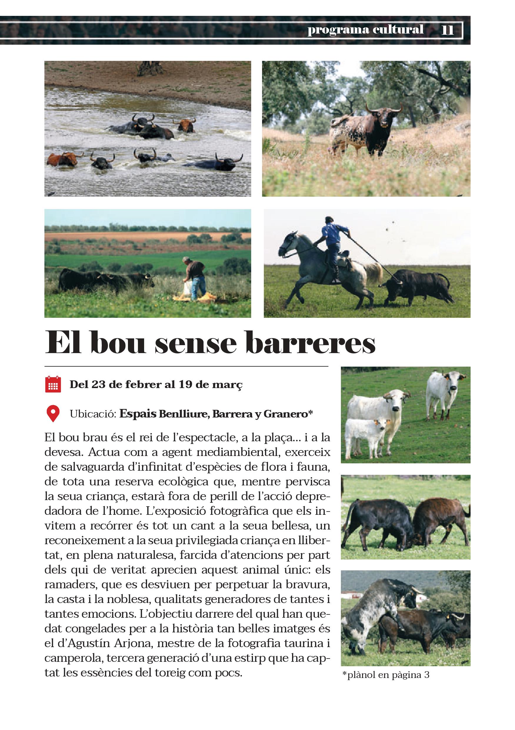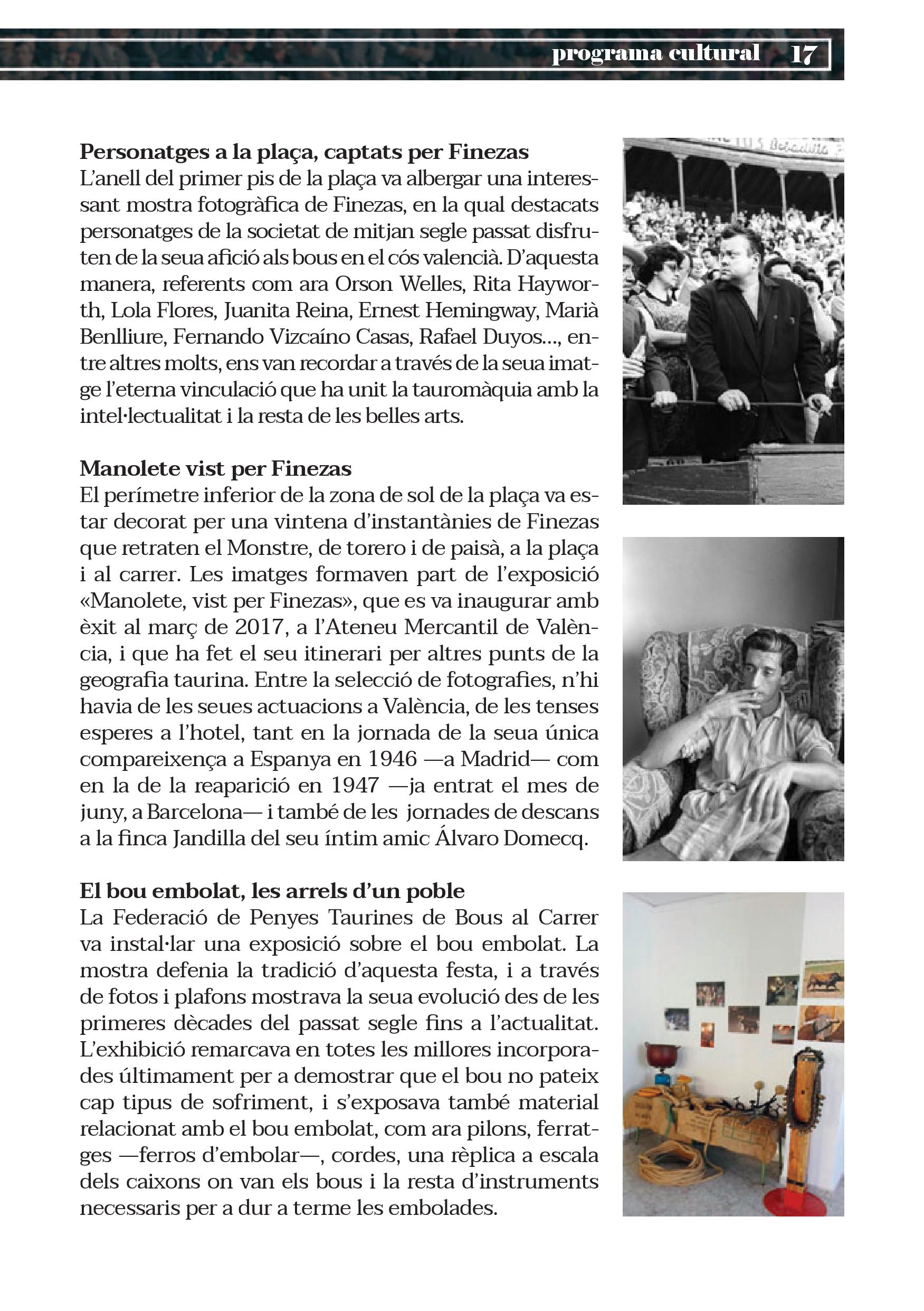 Totes i cadascuna de les cinc exposicions esmentades s’ubiquen en el perímetre inferior de la plaça de bous, però encara hi ha més. Vegen si no: dalt, en el primer pis, es recopila, en més de mig centenar d’imatges, el transcórrer artístic de la temporada taurina de 1968, una campanya de grans èxits que va quedar retratada a través de l’objectiu dels Finezas, una de les sagues de fotògrafs més arrelades en aquesta terra. Juntament amb aquesta, la sempre bella estampa del bou brau al camp és l’eix de la setena i última exposició, en la qual a l’animal, convertit en un ésser quasi mitològic, se li ret homenatge mitjançant una antologia gràfica d’una altra de les firmes de més reputació en el món del bou: la dels Arjona.