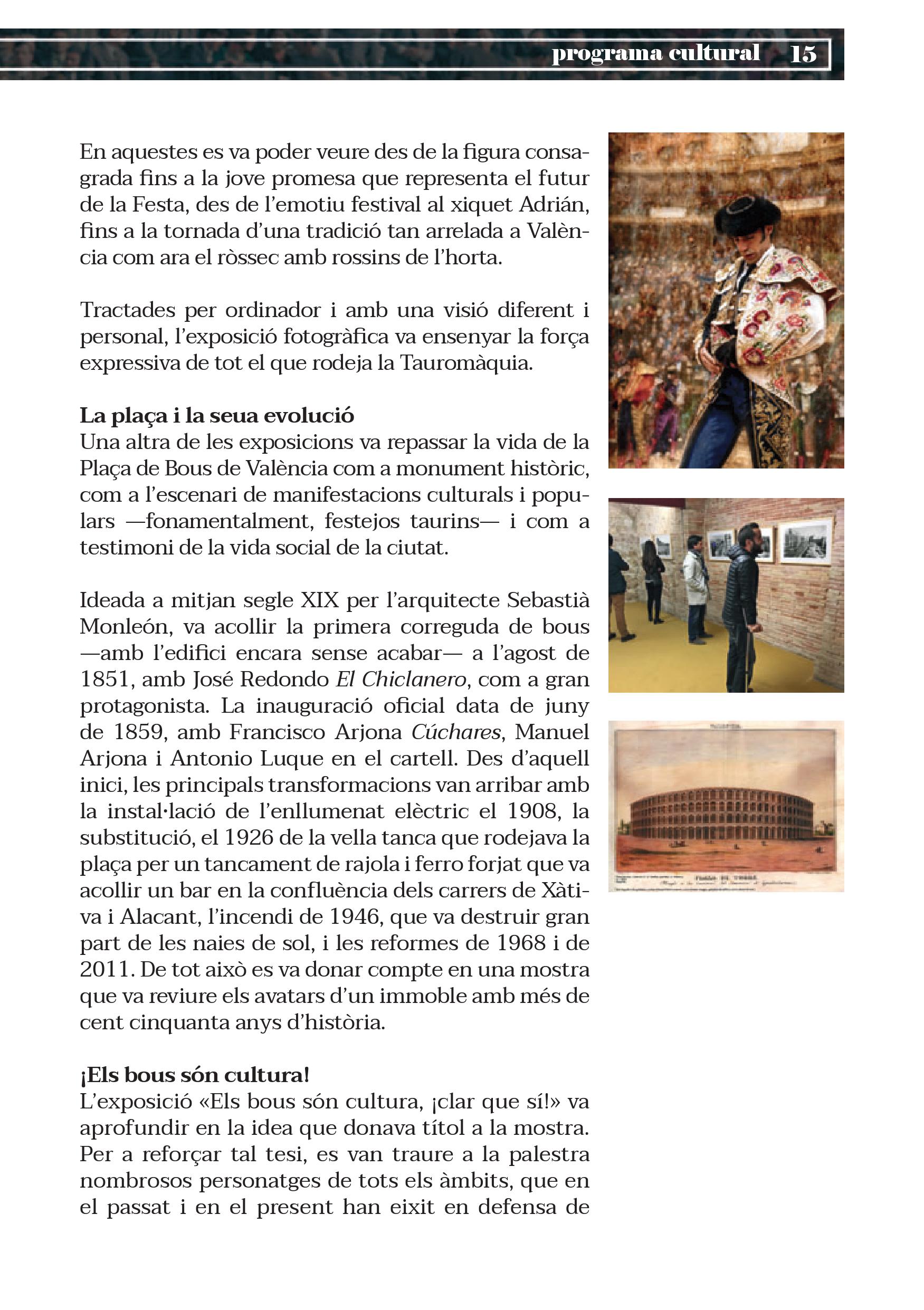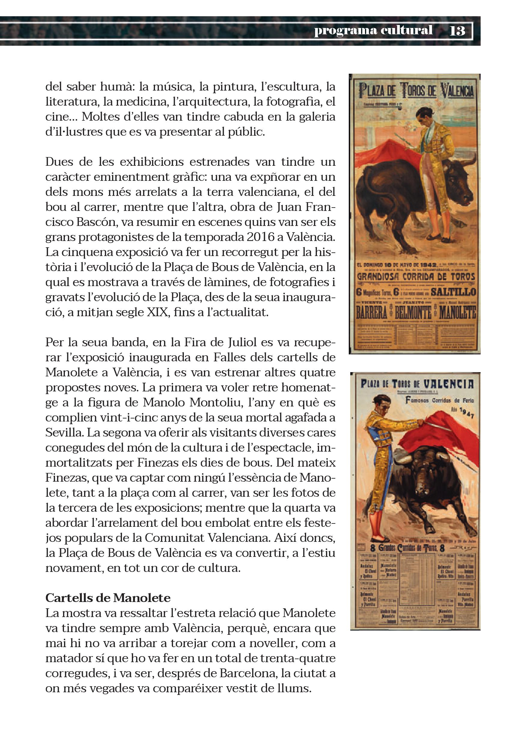 Un any més, la Diputació de València aposta decididament per la Plaça de Bous com a espai museístic. Entorn de les dues grans fires taurines de la ciutat, la de Falles i la de Juliol, la corporació provincial converteix el cós en una galeria d’art de primer nivell, en la qual un ampli ventall d’exposicions posa de manifest que el toreig, a més d’art, és cultura.