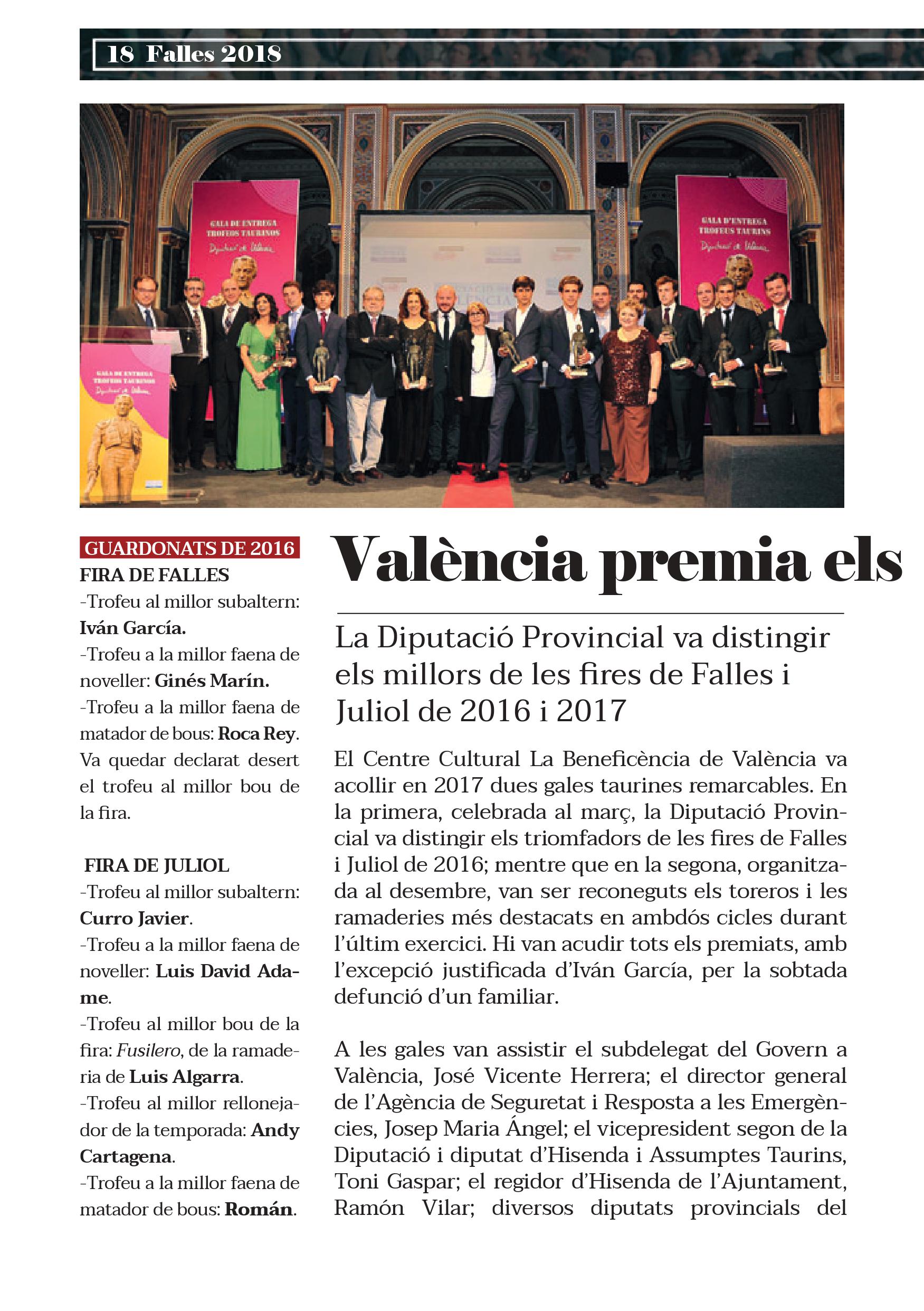 Entre el dissabte 10 de març i el dilluns 19 del mateix mes tindrà lloc en la plaça de bous de València la Fira de Falles. El programa, presentat per l'empresa Simón Casas Production, ho componen set corregudes de bous, tres corregudes de jònecs picades, una de piques i una correguda de jònecs sense picadors. Així, la primera gran fira de l'any repetix estructura i aposta per una conjunció entre les grans figures del toreig, com Ponce, Manzanares, Talavante, Cayetano, Castella, Perera, Roca Rey, i els jóvens valors que s'han guanyat la seua presència en una fira com a Falles, com és el cas de López Simón, Ginés Marín, Paco Ureña i Daniel Luque, entre altres.