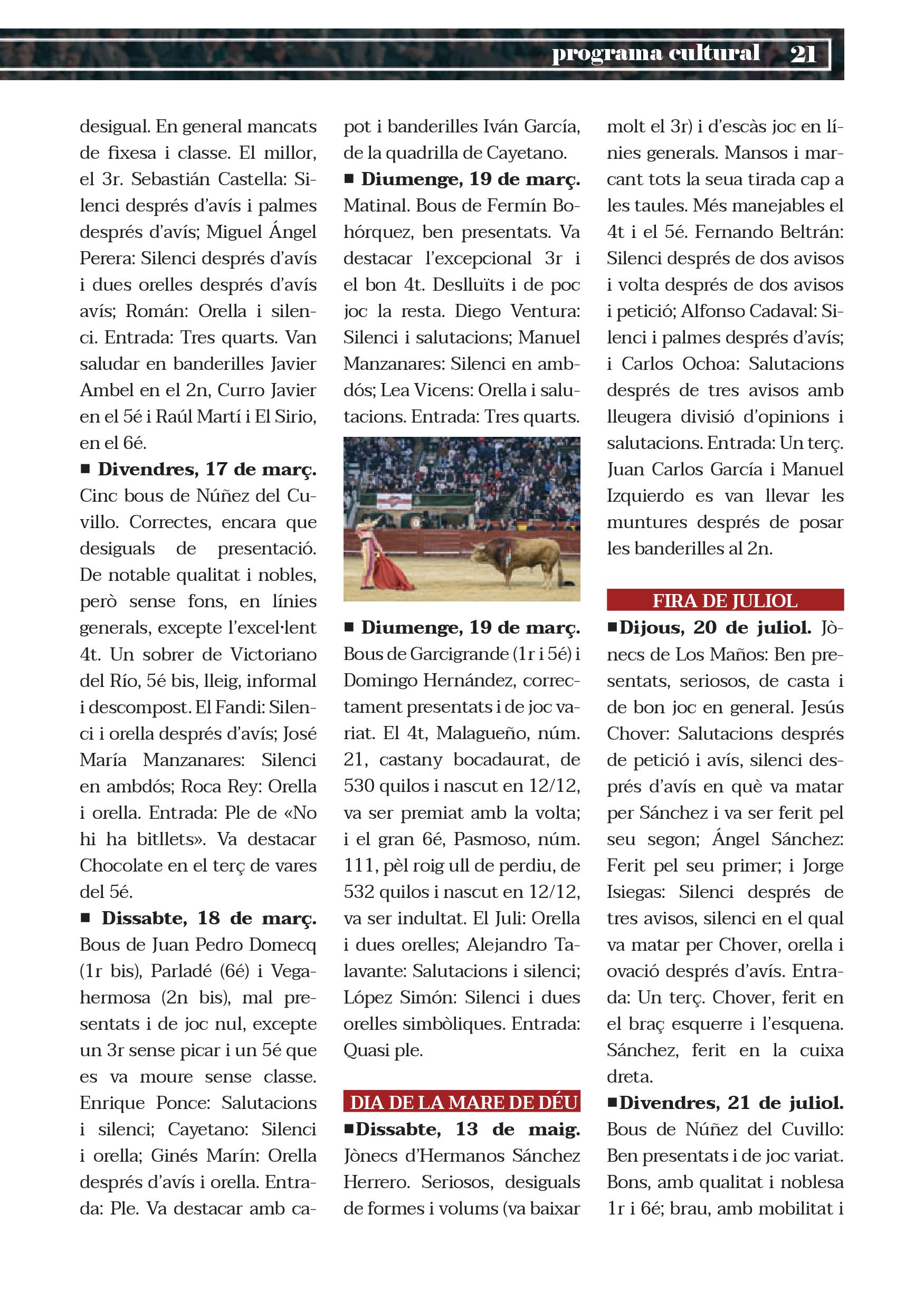 El diumenge 11 de març s'iniciaran les corregudes falleres amb el torero valencià Román Collado, que repetirà el dia de Sant Josep, 19 de març. En la seua primera aparició li acompanyaran en el cartell Juan José Padilla i El Fandi. Mentres que, en la correguda que tancarà la fira, estaran junt amb ell Antonio Ferrera i Ginés Marín.