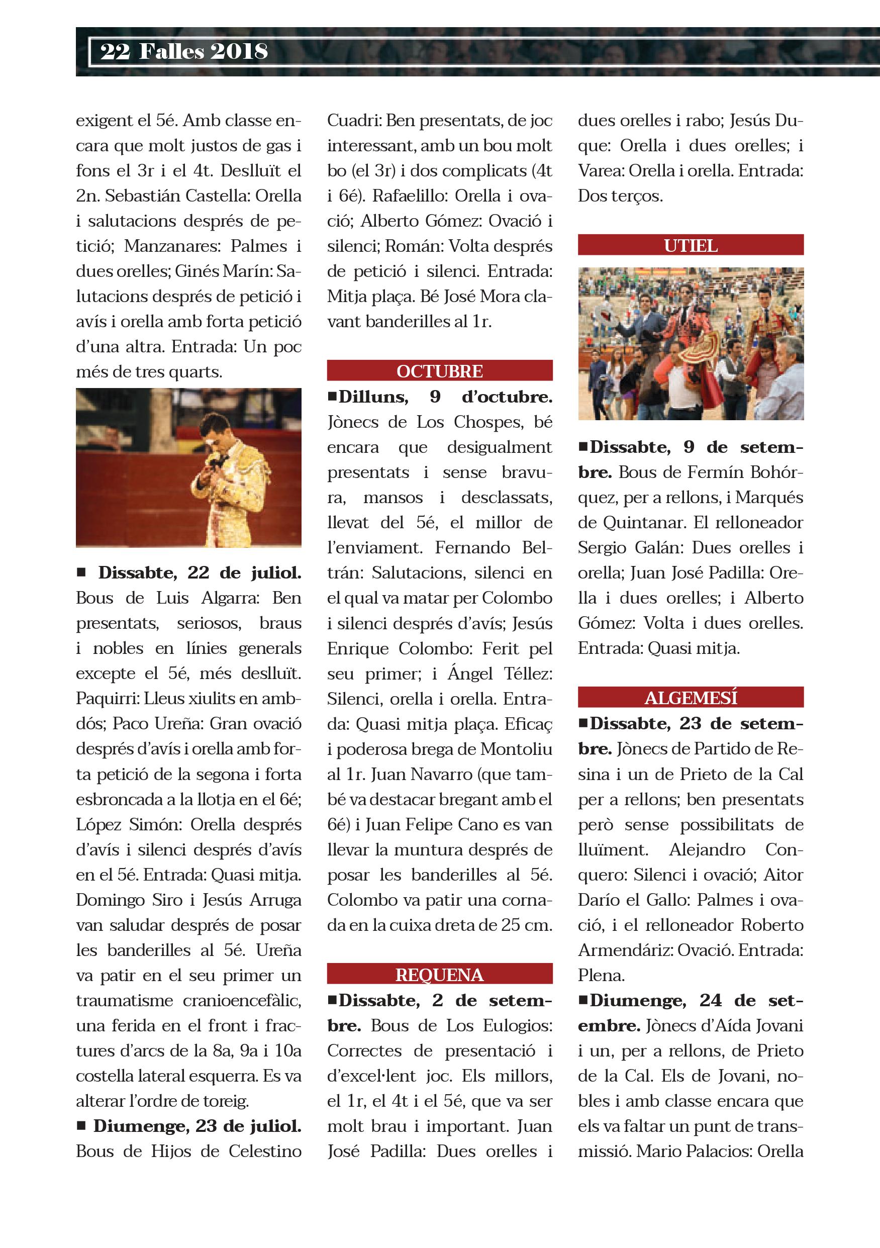 D'altra banda, per a octubre s'han programat una sèrie de festejos d'interés amb motiu del 9 d'octubre, dia de la Comunitat Valenciana. El 7 d'octubre se celebrarà una correguda de jònecs amb una terna valenciana al complet, el dissabte 6 una correguda de jònecs sense picadors i, com a novetat, el dimarts, 9 d'octubre se celebrarà un festival taurí a benefici de la lluita contra el càncer infantil en memòria de Adrián i de la Fundació del Bou de Lídia.