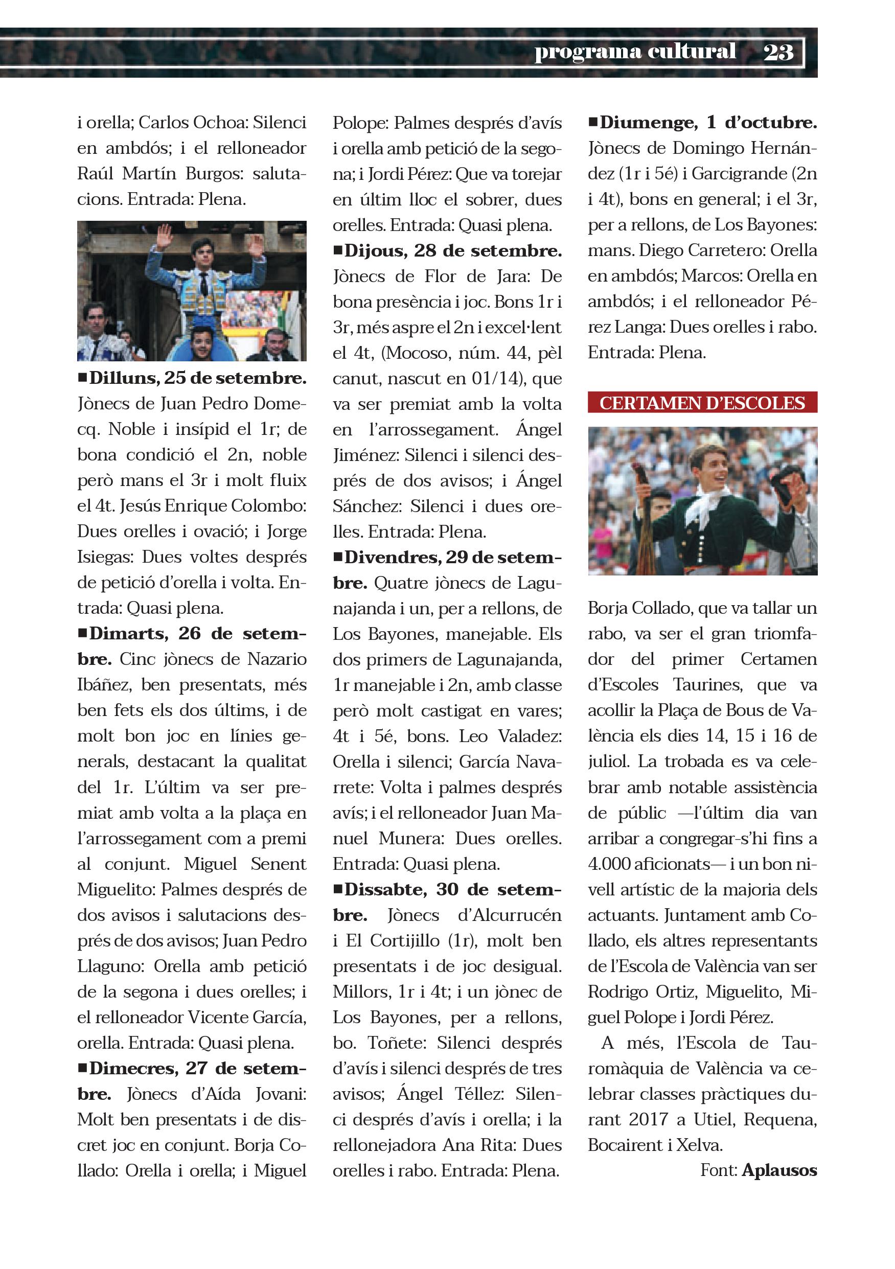 Per la seua banda, el II Certamen de Escolas Taurines, la entrada del qual és gratuïta, serà oferit per 18 Alumnes de les Escoles de València, Albacete, Vila Franca de Xira, Múrcia, Màlaga, Castelló, Béziers, Alacant, Salamanca, Almeria, Algesires, José Cubero "Yiyo" de Madrid, México, Nimes i Colmenar Viejo, que torejaran caps de las ramaderies de Fuente Ymbro, La Palmosilla i José Cruz. L'entrada és gratuïta.
