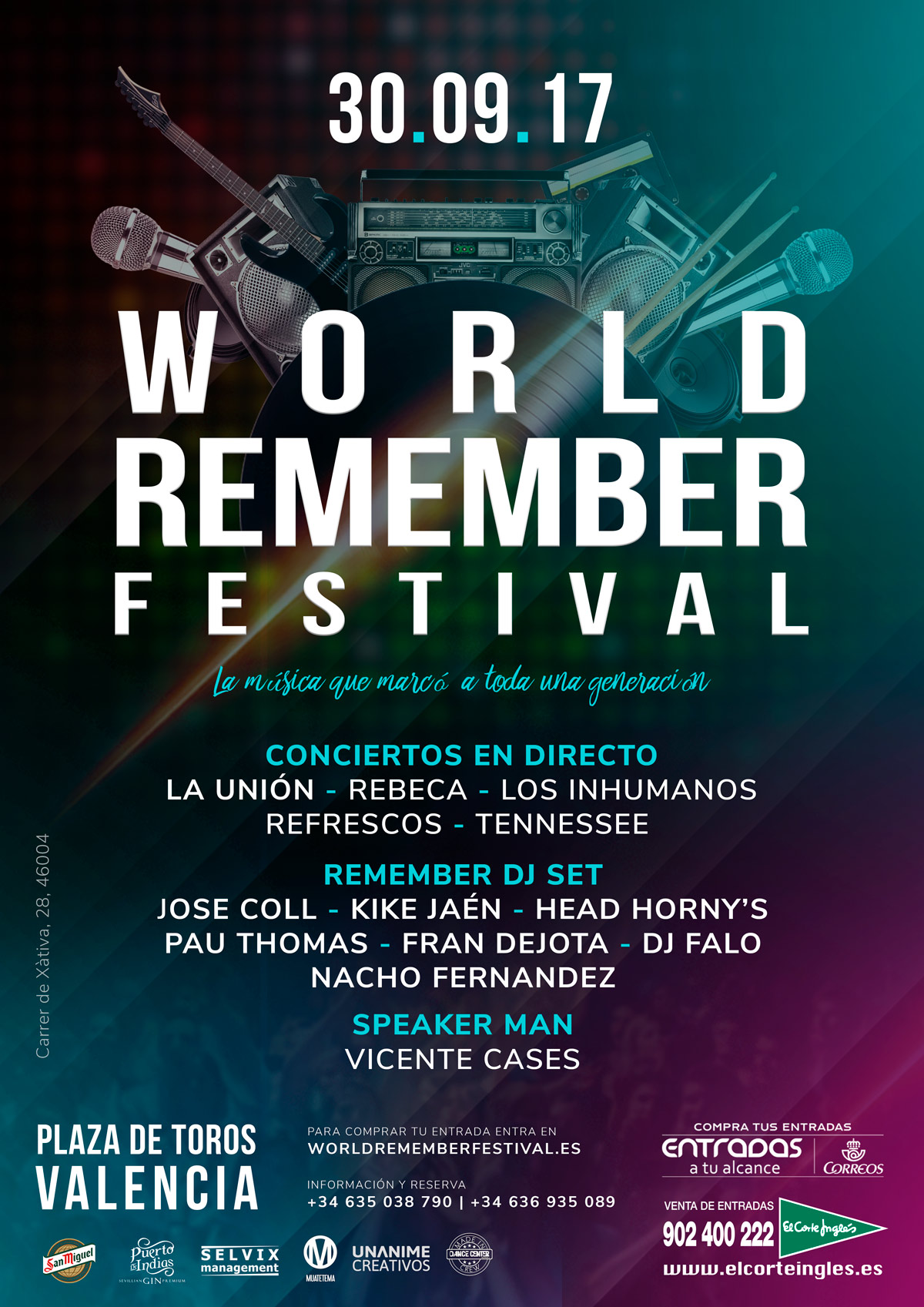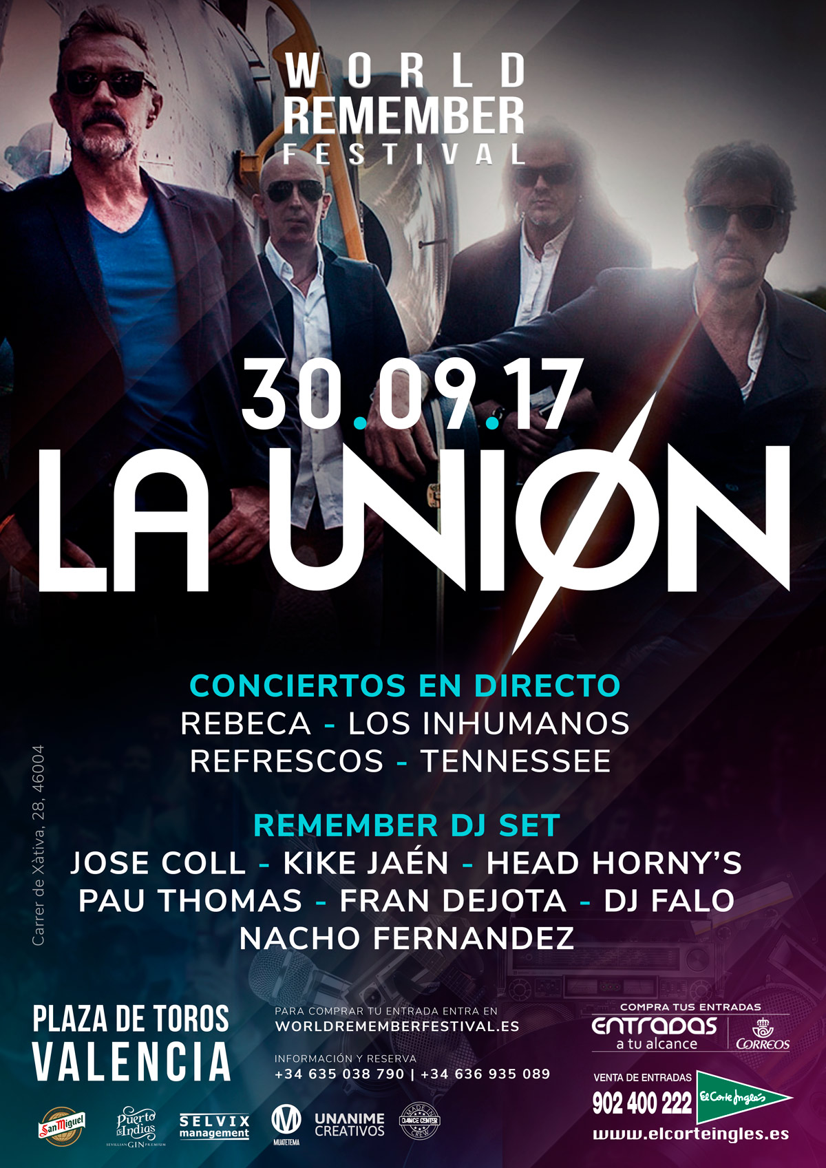 La apertura de puertas será a las 17 horas. Los conciertos en directo contarán con las actuaciones de La Unión, Los Inhumanos, Tenesse, The Refrescos y Rebeca. Mientras que el remember dj set estará formado por José Coll, Fran Dejota, Nacho Fernández, Head Horny's, Kike Jaén, Dj Falo y Pau Thomas.