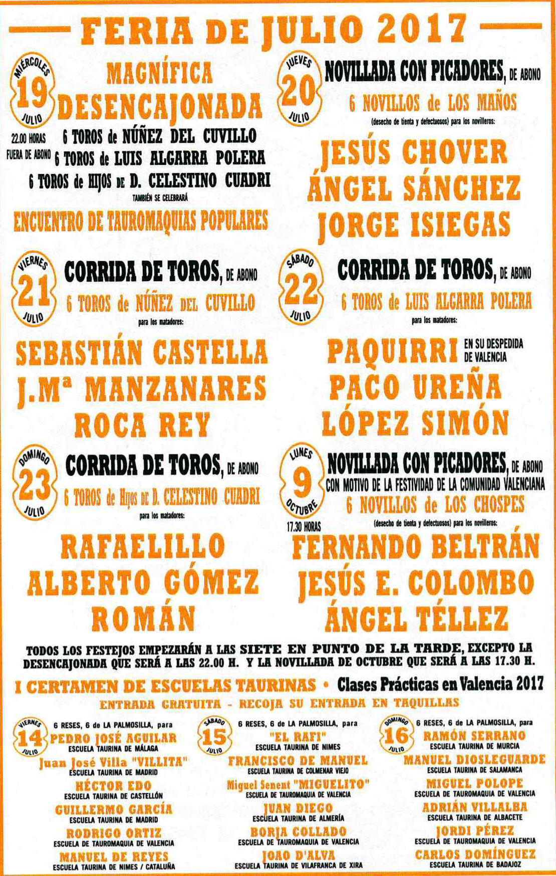 El miércoles 19, tendrá lugar por la noche la tradicional desencajonada con los tres hierros a lidiar, Núñez del Cuvillo, Luis Algarra y Celestino Cuadri. Pero, el cartel será inaugurado por el I Certamen de Escuelas Taurinas el día 14. Durante ese viernes y el fin de semana del 15 y 16 de julio, los alumnos de diferentes escuelas taurinas de España serán los protagonistas de tres novilladas de promoción ante reses de La Palmosilla.