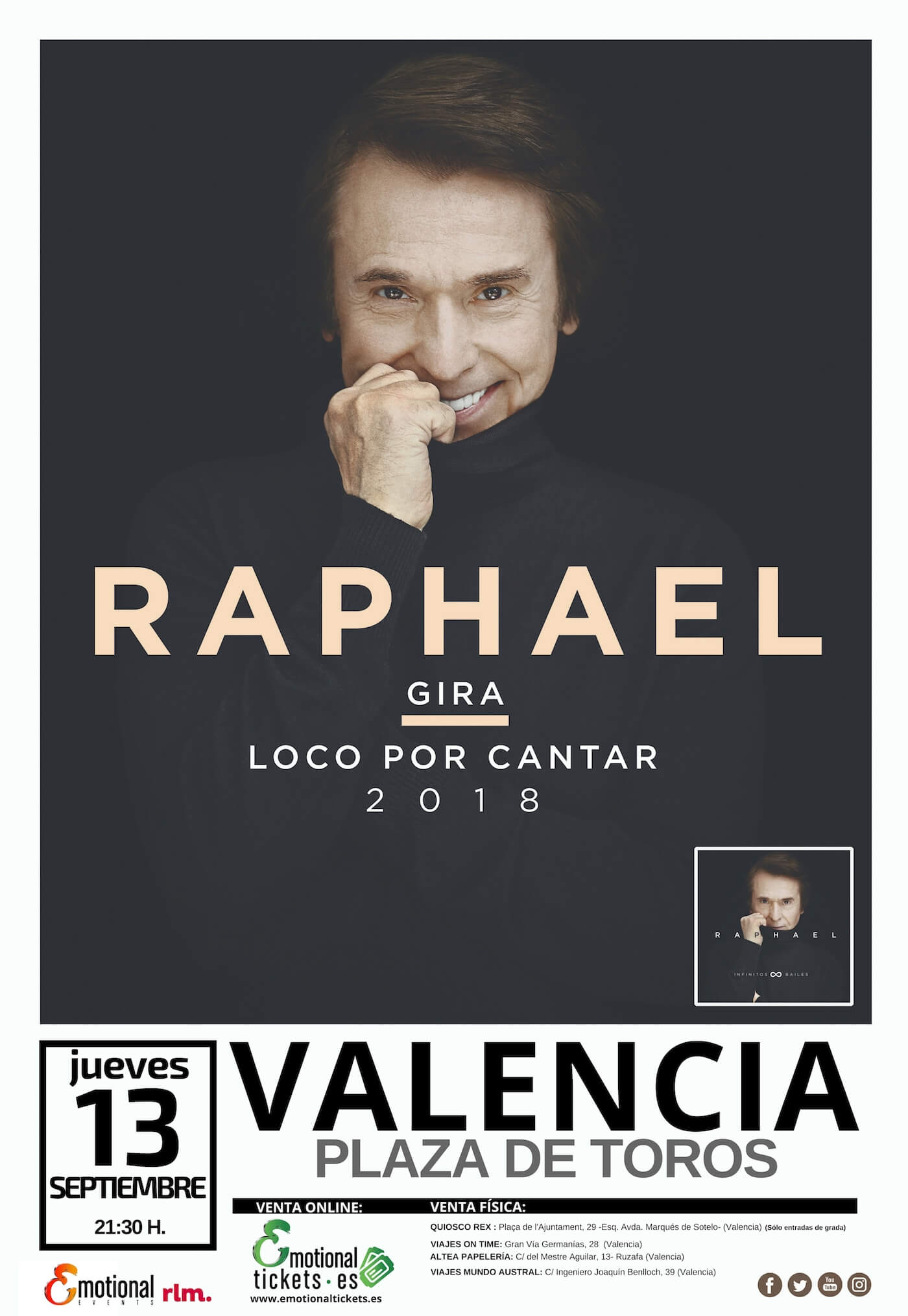 Raphael presenta el 13 de septiembre en la plaza de toros Valencia ‘Loco por cantar’, la gira de sus nuevas canciones y de todos sus éxitos. Presentará un espectáculo donde los temas incluidos en su álbum ‘Infinitos Bailes’, compuestos por los artistas más destacados de la industria, serán el eje de un show totalmente renovado. Raphael corresponderá a la fidelidad de su público y no olvidará incluir sus grandes éxitos de siempre.