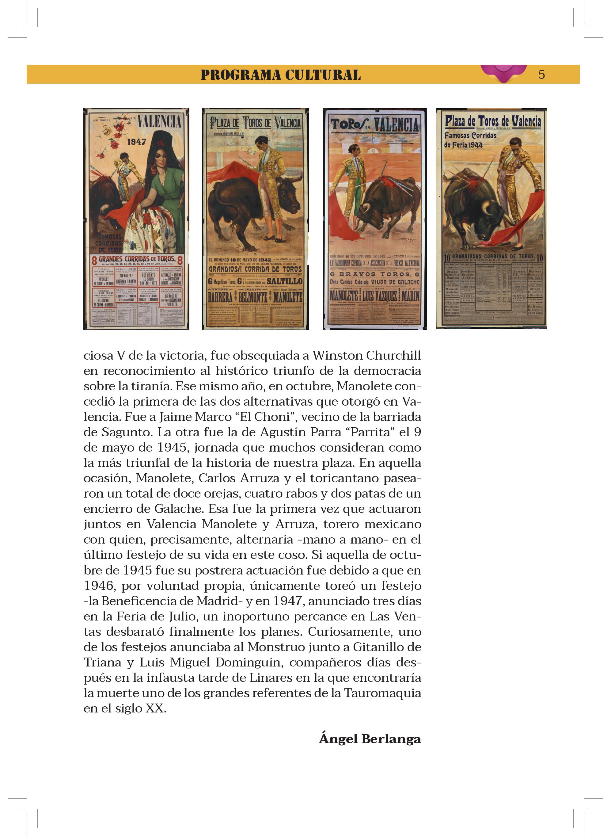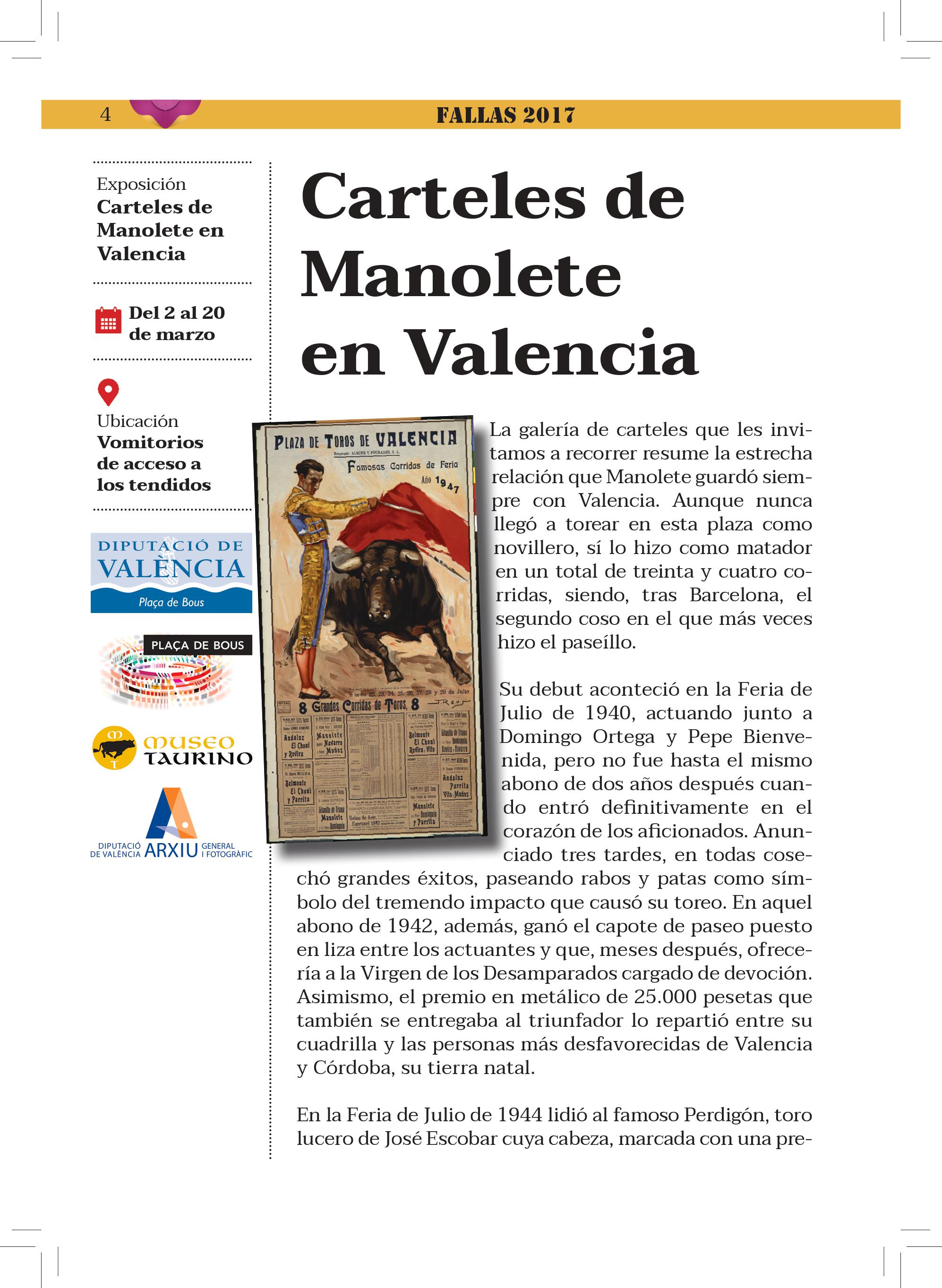 La plaza de toros de Valencia por fin se abre al ámbito cultural. Hasta cinco muestras distintas pueden visitarse del 2 al 20 de marzo. La primera tiene a Manolete como eje indiscutible, en el año en el que se conmemoran cien de su nacimiento. Además, al centenario de su venida al mundo se suma el septuagésimo aniversario de su mortal cogida en Linares. Bajo el pretexto de conmemorar ambas efemérides, la Diputación recupera de su archivo todos los carteles en los que El Monstruo estuvo anunciado en Valencia.